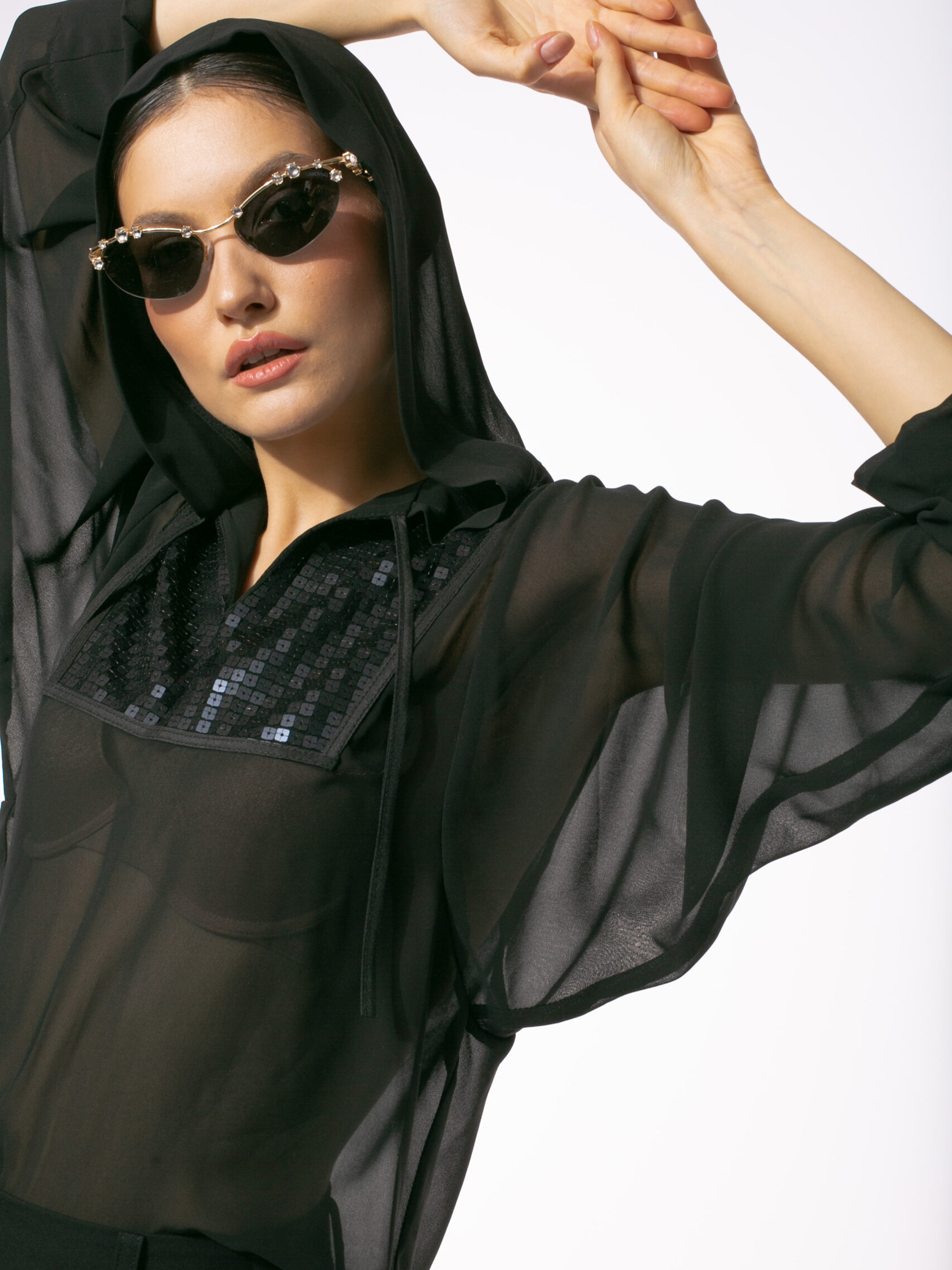 Bluza din voal cu platcă din paiete are mâneci lungi lejere și o glugă chic, această bluză oferă un croi confortabil și o siluetă fluidă. Ideală pentru ținute de seară sau evenimente speciale, bluza se remarcă prin contrastul rafinat dintre materialul vaporos și platcă din paiete.