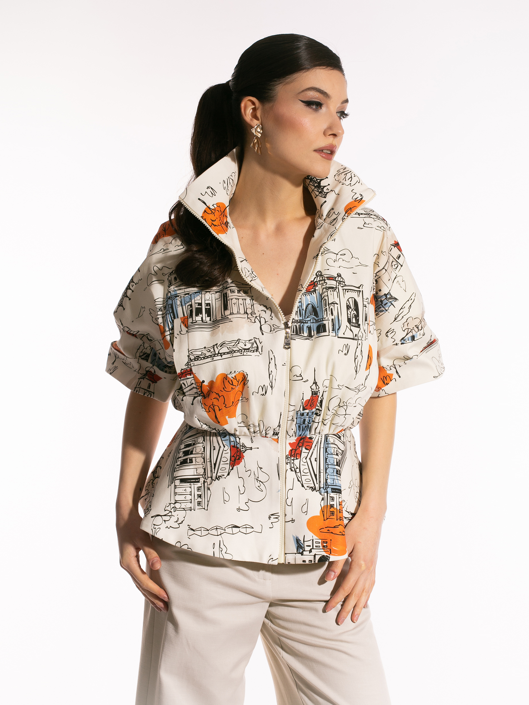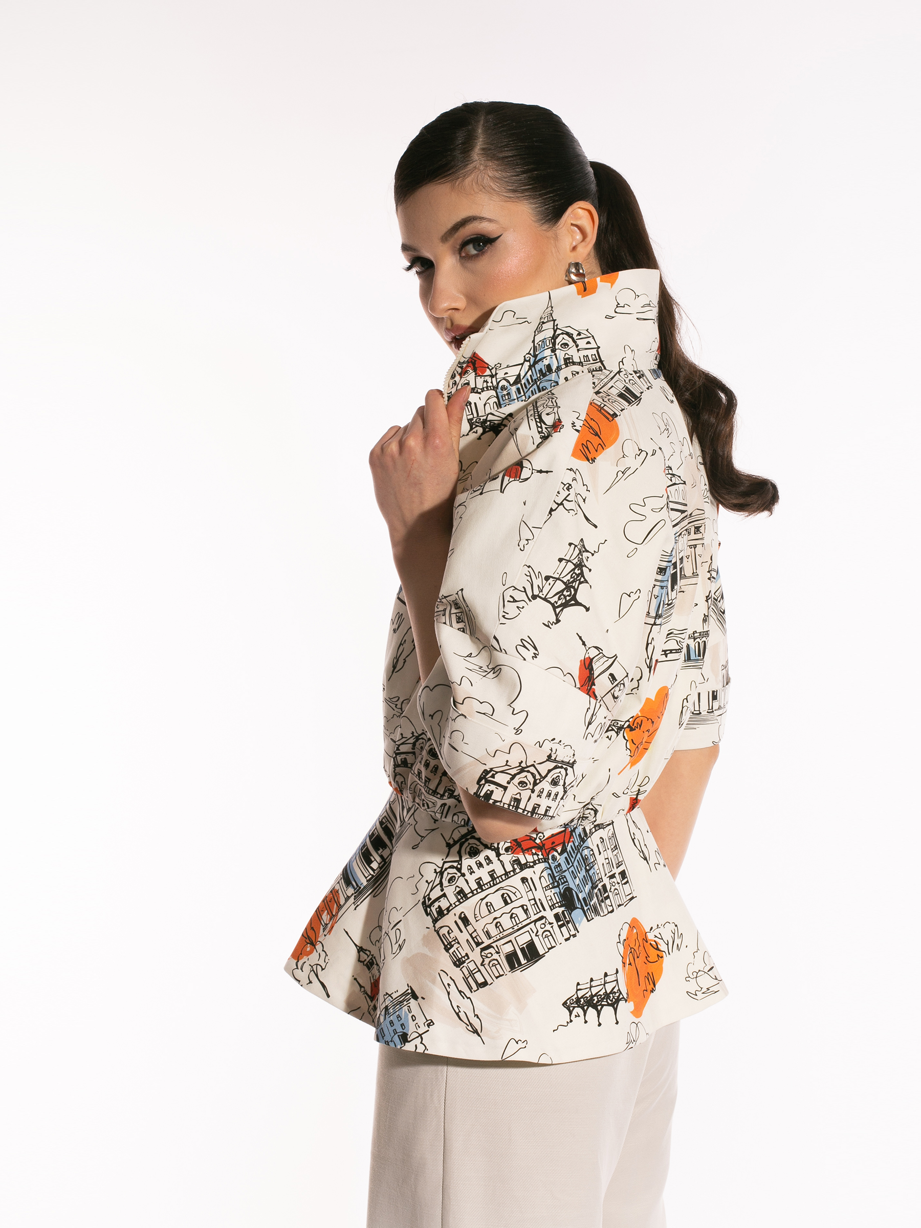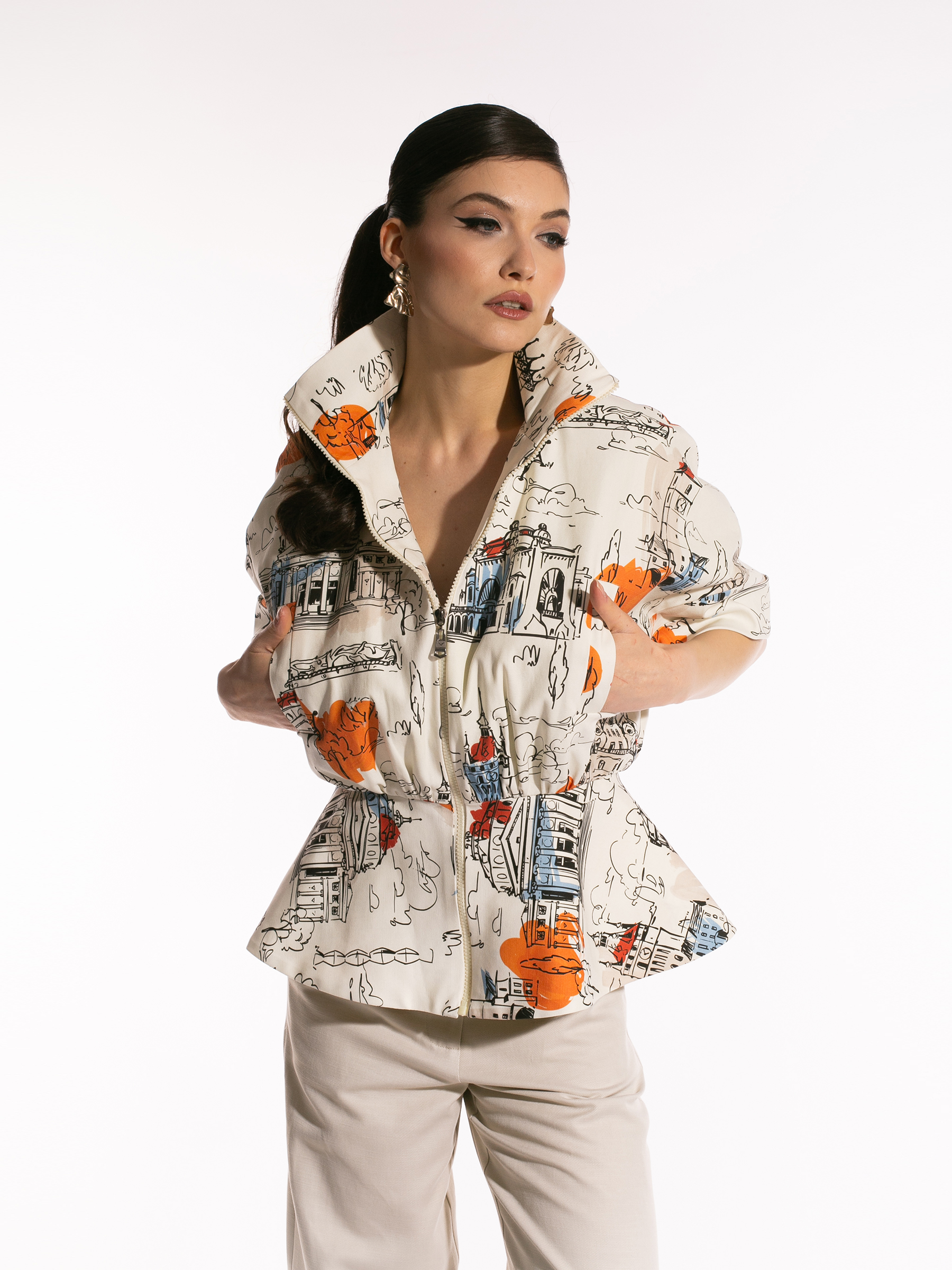 Jacheta este realizată din bumbac, este căptușită și are mânecă scurtă. Este prevăzută cu fermoar metalic frontal și buzunare cu refileți pe piept. Modelul are o structură supradimensionată, cu peplum în talie, cw conturează o siluetă modernă și feminină.
