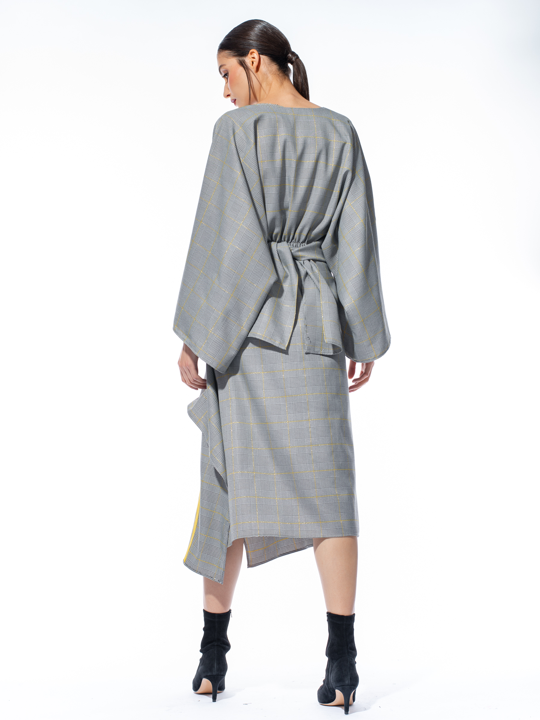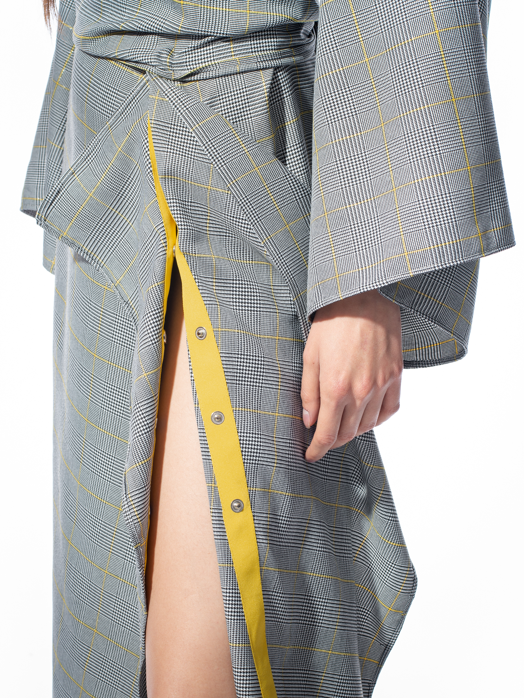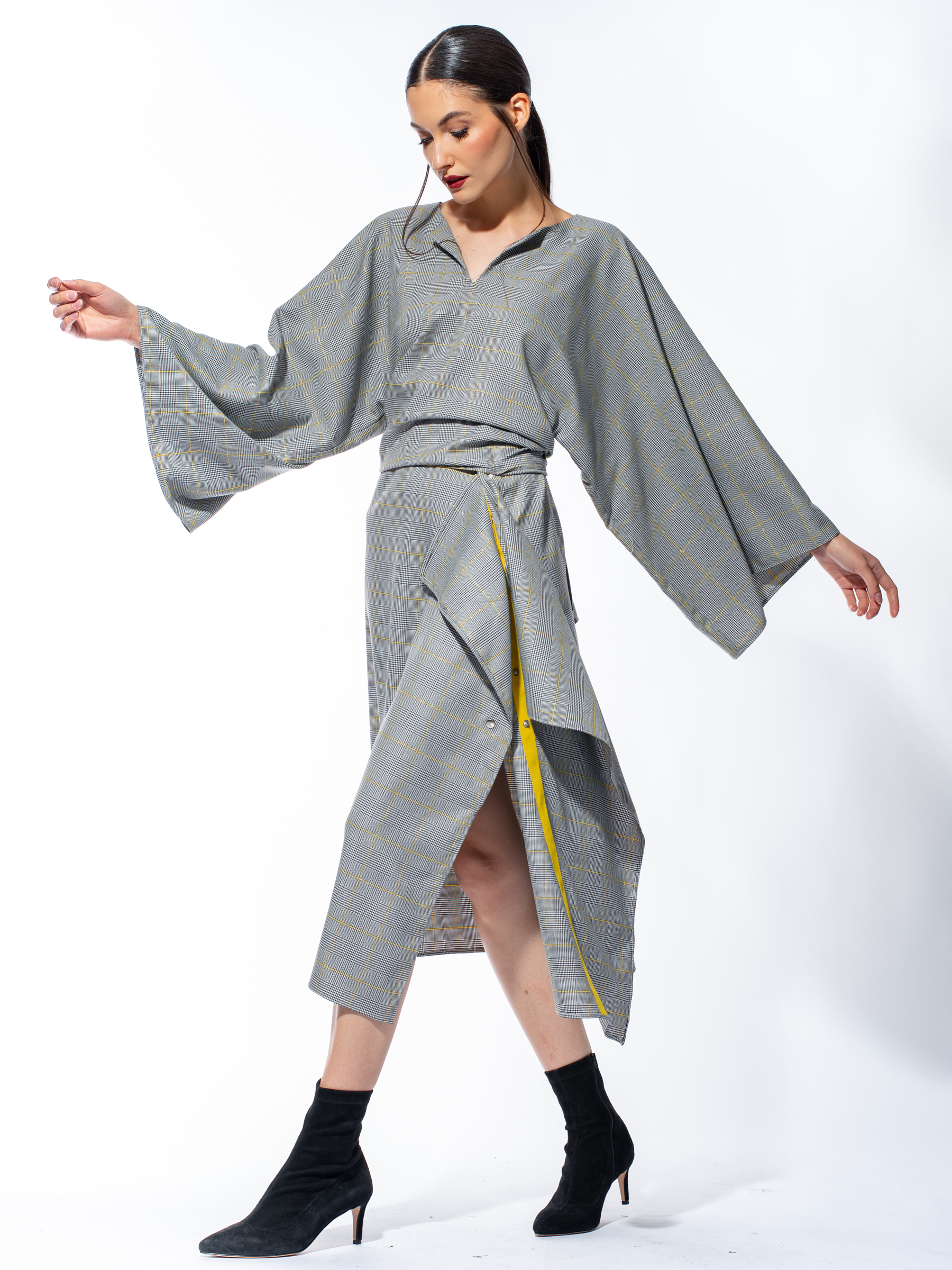 Creată cu gândul la sustenabilitate, această rochie este croită pentru a reduce numărul de tăieturi și risipa de material. Are o linie de croi geometrică și se închide cu ajutorul capselor, permițând transformarea ei rapidă, în doar câteva secunde, într-o bluză.