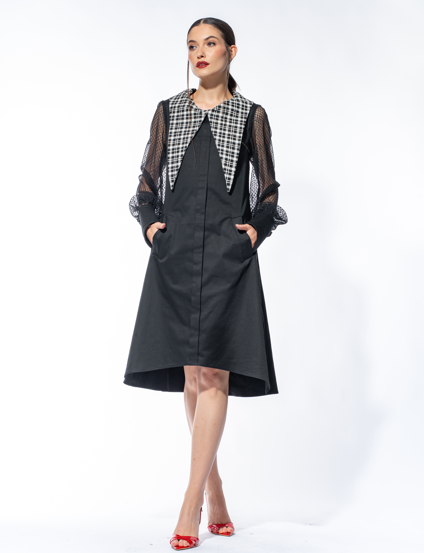 Rochie neagră din bumbac cu guler detașabil Chest este realizată din bumbac și are o linie de croi în formă de A, care oferă lejeritate și eleganță. Rochia are buzunare cu refileți poziționate pe mijlocul feței, o cută dublă ce alungește vizual silueta și tiv asimetric.