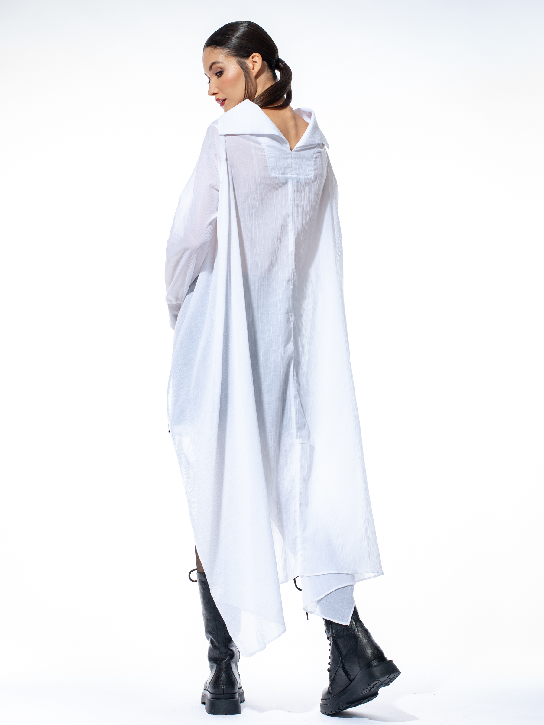 Cămașa albă din pânză de bumbac Zero Waste este realizată din pânză topită, diafană, reprezentând o declarație de sustenabilitate și dorința de a reduce risipa de țesături. Tiparul este conceput astfel încât pierderile să fie minime, de doar 1%. Cămașa are o linie de croi asimetrică, lejeră, cu mâneci cu manșete specifice brandului și guler cu rever.
