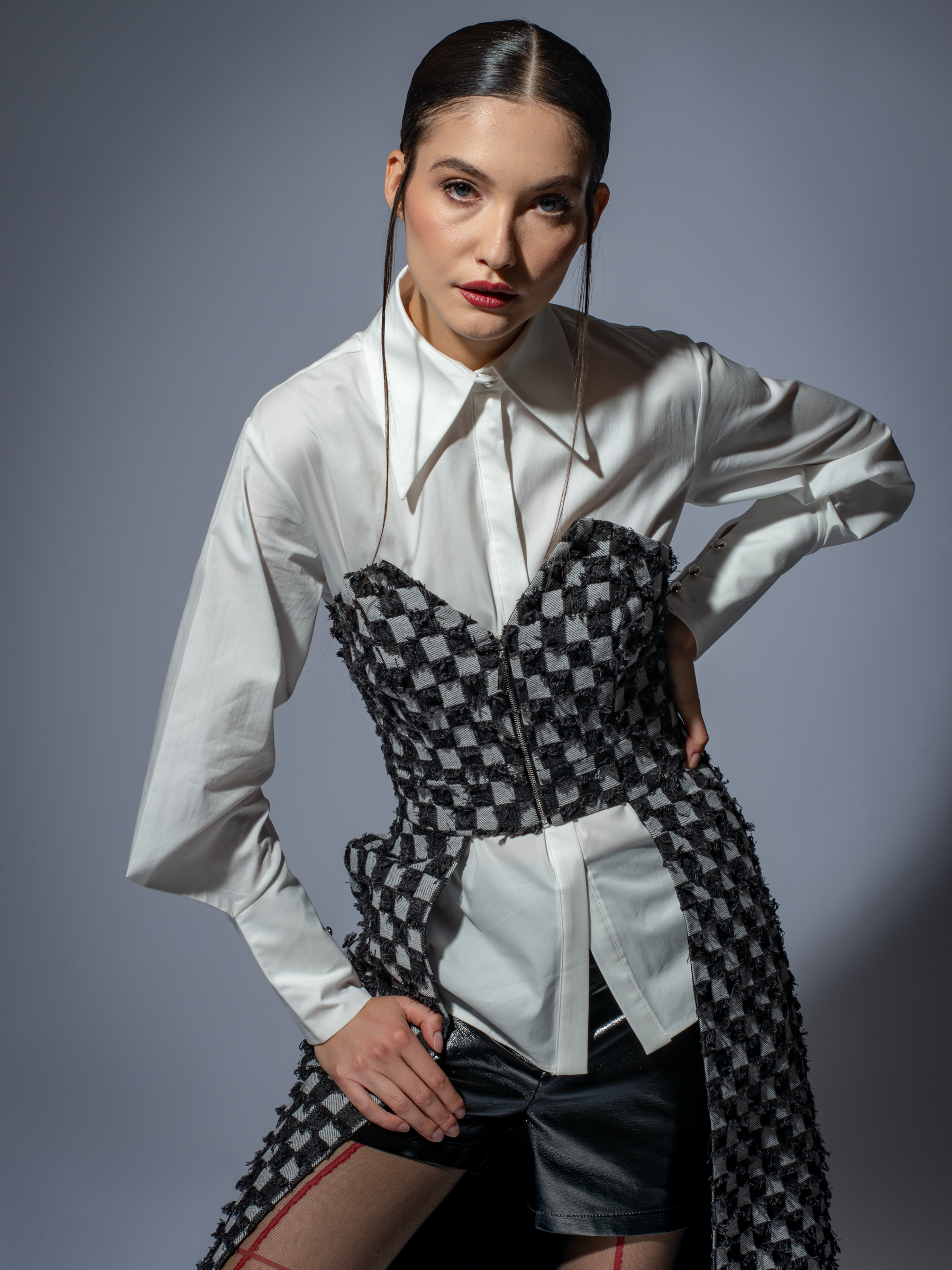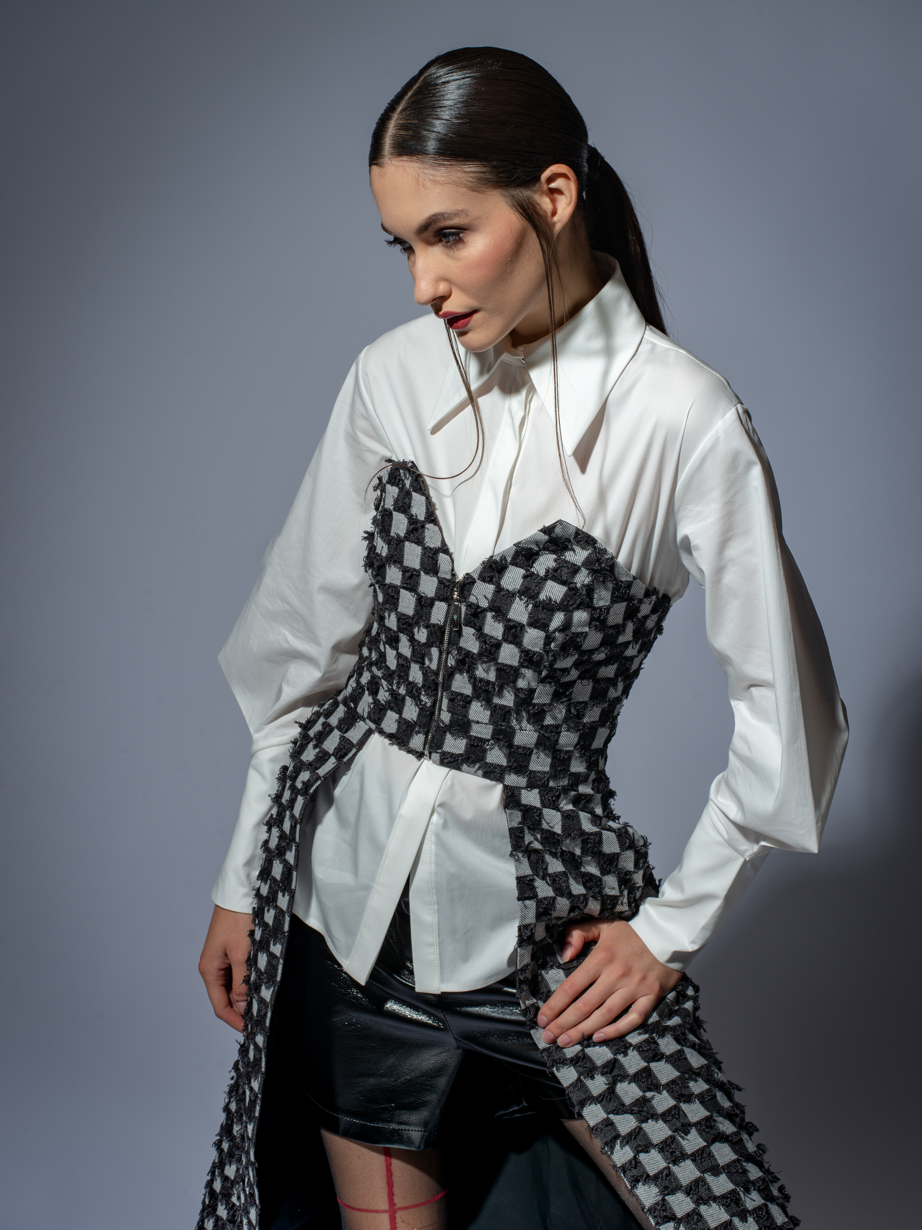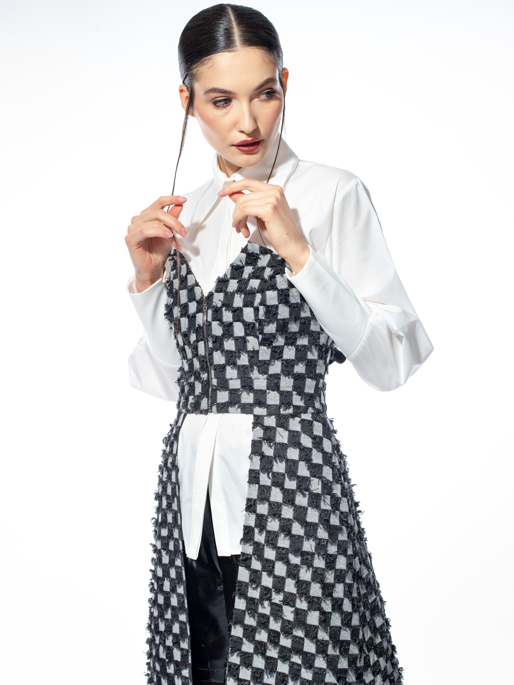 Pornind de la tiparul de corset, această vestă îți reinventează lookul în câteva clipe. Vesta se închide cu un fermoar metalic amplasat pe față, iar pe spate prezintă ocheți metalici pentru ajustarea circumferinței bustului. Are buzunare laterale și este realizată din denim gri, cu model geometric.